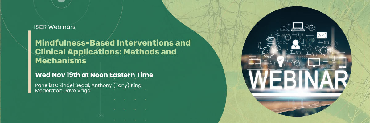 Join us for an insightful 90-minute webinar, “Mindfulness-Based Interventions and Clinical Applications: Methods and Mechanisms,” moderated by Dr. David Vago, incoming President of ISCR. This dynamic session features leading experts in the field—Dr. Zindel Segal (University of Toronto), Dr. Anthony King (Ohio State University), and Dr. Elizabeth Hoge (Georgetown University)—as they explore the latest research and practical applications of mindfulness in treating depression, anxiety, PTSD, and more. Attendees will gain a deeper understanding of how mindfulness-based interventions (MBIs) can be integrated into clinical practice, with a focus on their underlying neurobiological and psychological mechanisms.